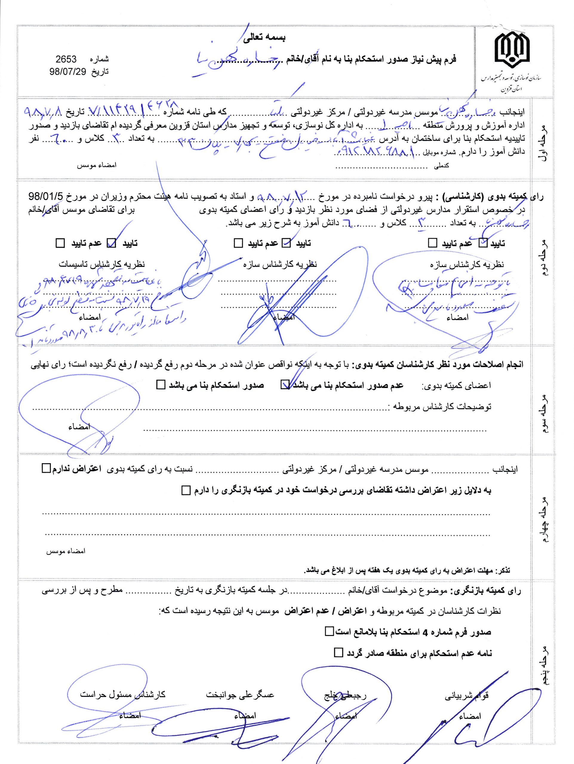 براساس آیین نامه استقرار مدارس و مراکز غیردولتی شماره ۵٧٨٣٩/۴٢٨١٣مورخ ١۶/٣/٨٩مصوب هیات محترم وزیران، جوانب فنی و ایمنی ساختمان و تایید استحکام بنا توسط ادارات کل نوسازی، توسعه و تجهیز مدارس استان ها انجام می پذیرد و این فرآیند در بازه های زمانی سالیانه می باشد